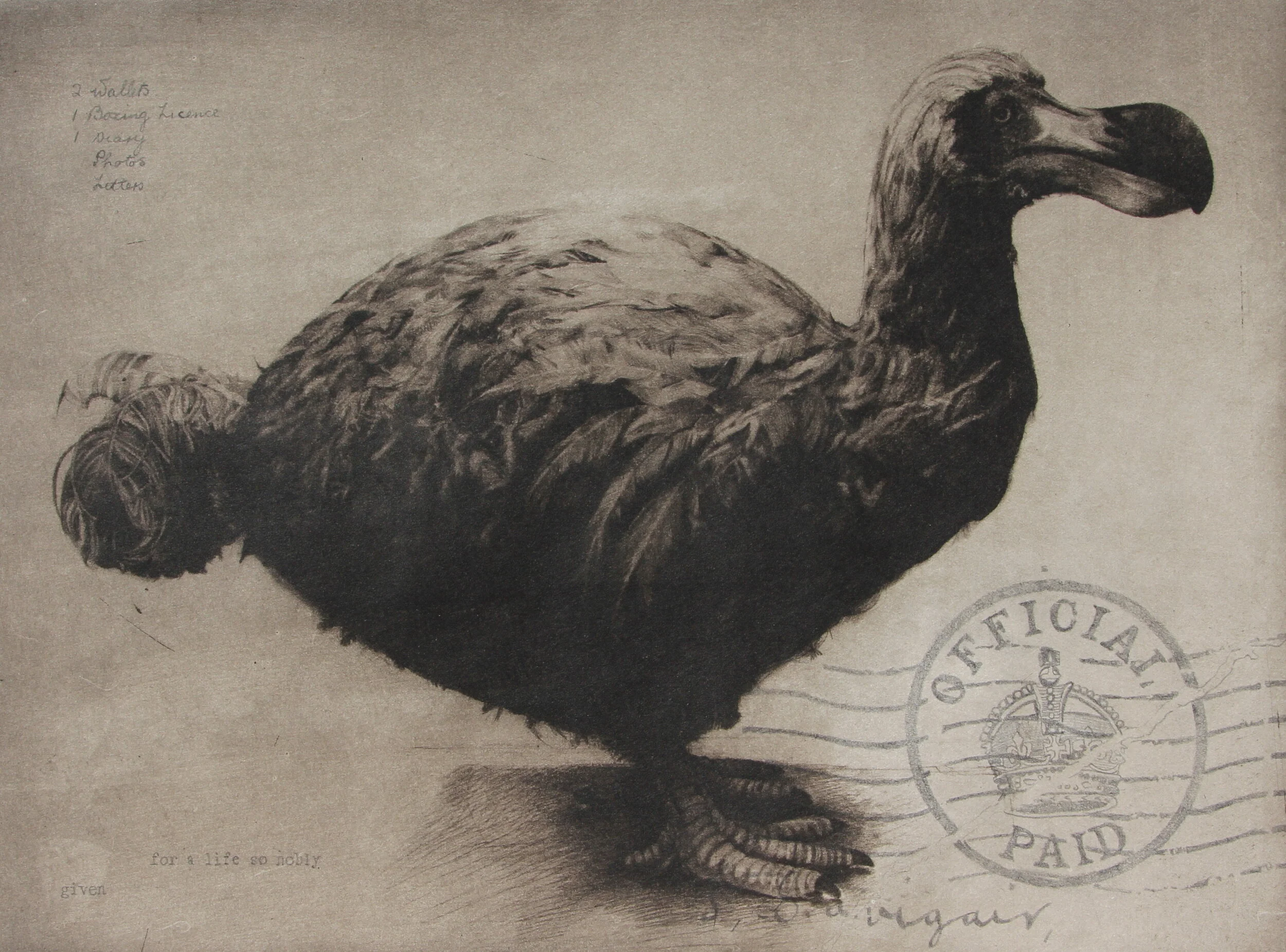 The plight of the rhinoceros led me to consider the dodo. I have visited the two dodo models in the Natural History Museum whenever taking my children there, and have always been intrigued to watch as visitors react to seeing them. The dodo is probably the strongest image of extinction, and through drawing and developing the prints it has become, for me, a symbol of loss.